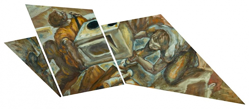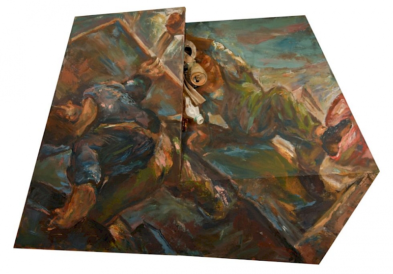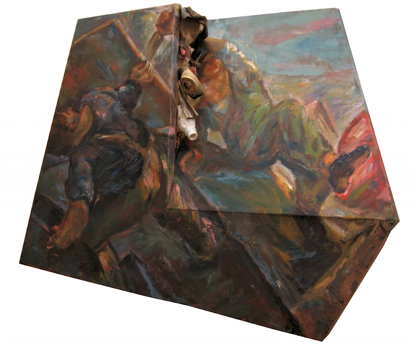 V nekaterih slikah gre Zorović še dlje. Slikovno površino dejansko prelomi, da nastanejo tridimenzionalni geometrični liki. V stik med dvema prelomljenima površinama pa postavi realne predmete, seveda odpadke. Predmeti so vkomponirani v tkivo slike, kot bi se spontano materializirali iz nesnovne podobe, iz naslikanih odpadkov. Gledalec se tako znajde v novi likovni igri, dogajanje postane še kompleksnejše. Fizično pregibanje nosilca ravno tako sledi notranji logiki kompozicije, saj je prostor podob pogosto nalomljen, prehaja od običajne perspektive v ptičjo, gledalčev pogled se torej mestoma dvigne nad protagoniste, drugje pa se spusti in se pred njim odpre slutnja horizonta.