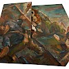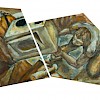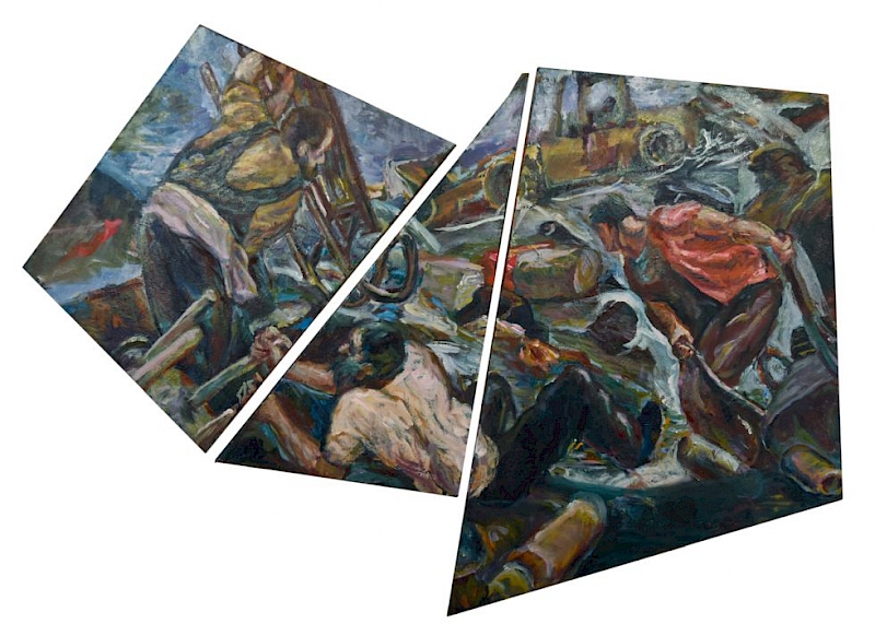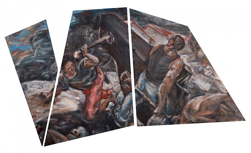 K dinamičnosti upodobljenih prizorov prispevajo tudi oblikovani nosilci, ki sledijo logiki ekspresivnih gibov figur, ko s titansko odločnostjo premikajo robove klasičnega, pravokotnega formata in jih oblikujejo v ostre geometrične like. Ta odnos sproža presenetljiv vtis širjenja podob, kot bi liki poskušali zasesti zunanji prostor, zidove. V tem občutimo nekaj grozečega, a ker protagonisti ne silijo proti nam, nas to dogajanje hkrati pritegne, vabi k soudeležbi, empatiji.